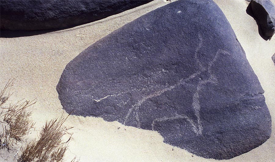 Through winding ravines, once abraded out of the solid granite bedrock by the pebble transporting streams, we move on into the inner of the volcanic massif. Prehistoric engravings overhanging our nightcamp open a view at life in this valley 5,000 years ago. The glow of our fire sheds light on herdsmen, grazing cattle and a giant cat of prey tensed like a bow.